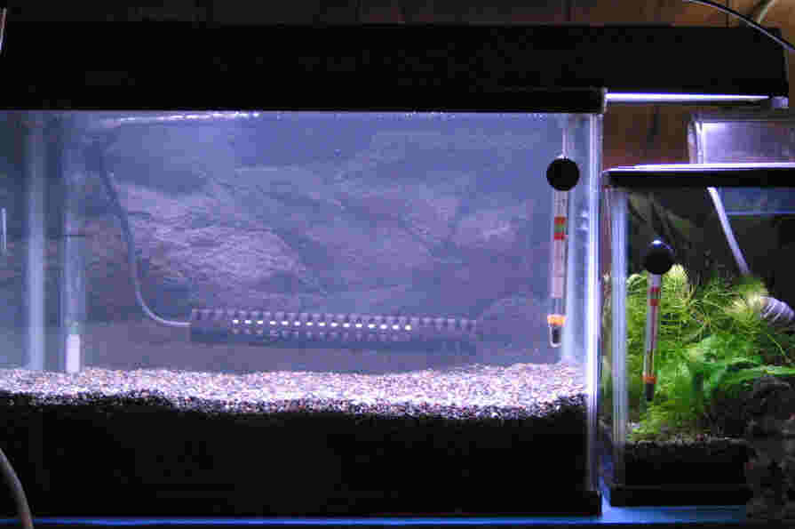 エアーリフトにエアーポンプをつなぎ、水温計・ヒーターを取り付け、照明を上に載せセット完了。
